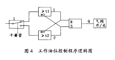 液位計(jì)筒體內(nèi)徑d/~i0mm,標(biāo)尺長750mm。750mm×20%=150mm,280÷750=37.3%),液位計(jì)油位滯后于貯罐油位變化。液位計(jì)回油時(shí),浮筒漂向管口,則阻尼作用更強(qiáng)了,低油位*限開關(guān)LB/LVL6不能及時(shí)動(dòng)作和關(guān)閉氣閥LB/EV2是造成貯油罐泄空而計(jì)算機(jī)未執(zhí)行油位故障處理程序的原因。圖3 液位計(jì)故障剖析圖3.2 液位檢測開關(guān)和控制程序干簧管式接近開關(guān)本身依靠磁控開或合,易受周圍磁場干擾產(chǎn)生誤動(dòng)?,F(xiàn)場液位計(jì)安裝位置一側(cè)與電纜橋架相鄰,而另一側(cè)常有行車電磁吸盤吊裝鋼卷作業(yè)。從工作油位控制邏輯過程可以看出(圖4):盡管油位檢測開關(guān)已通,每15s(t1=t2=15s)內(nèi),只要存在一次脈沖干擾,開氣閥電路回路將未被選通。反之亦然。因此,干簧管式接近開關(guān)誤動(dòng)產(chǎn)生錯(cuò)誤控制,也是釀成事故的另一個(gè)原因。