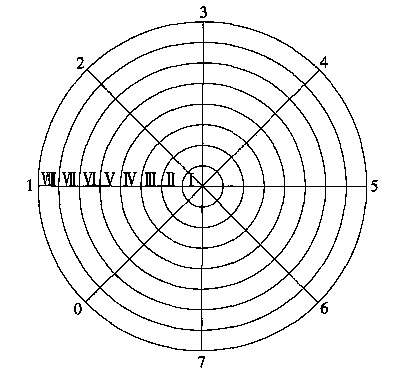 1.2.2 幾何測量法根據(jù)立式金屬罐容量試行檢定規(guī)程,把圓錐體底圓分成M 個(gè)同心圓,根據(jù)所分圓環(huán)面積相等條件決定半徑。圓錐體分為一個(gè)小圓錐和多個(gè)圓臺。在每個(gè)圓心圓周測N 個(gè)點(diǎn),即測N 個(gè)點(diǎn)到罐底中心的高度。底量測量原理見圖2。