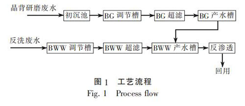 晶背研磨廢水在排放機(jī)臺(tái)附近設(shè)置簡易平流式沉淀池, 經(jīng)初沉后進(jìn)入調(diào)節(jié)槽, 經(jīng)過保安過濾器過濾后, 再進(jìn)超濾膜組, 產(chǎn)水流入產(chǎn)水槽; 反洗廢水進(jìn)入調(diào)節(jié)槽, 經(jīng)過保安過濾器過濾后, 再進(jìn)超濾膜組, 產(chǎn)水流入產(chǎn)水槽。 兩種超濾產(chǎn)水混合后, 經(jīng)保安過濾器, 進(jìn)入反滲透膜組, 產(chǎn)水回用至超純水預(yù)處理系統(tǒng), 濃水排放至廢水系統(tǒng)。
