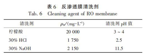 反滲透膜運(yùn)行一定時(shí)間后, 污染物會(huì)在膜表面沉積, 需要定期進(jìn)行化學(xué)清洗以完全恢復(fù)膜性能。 本系統(tǒng)設(shè)計(jì)清洗周期為 3 個(gè)月, 清洗包括循環(huán)、 浸泡、 沖洗 3 個(gè)過程, 將清洗劑引入反滲透膜 組 , 按 每 支 膜 11.4 L / min 的 流 量 循 環(huán) 5 ~ 15min, 再將單支膜流量調(diào)至 22.8 L / min 循環(huán) 5 ~ 15min, 然后再將單支膜流量調(diào)至 35 L / min 循環(huán) 30 ~60 min, 隨后進(jìn)入浸泡階段, 1 ~ 2 h 后進(jìn)行沖洗,直至濃水電導(dǎo)率與進(jìn)水電導(dǎo)率相同。 反滲透膜采用先酸洗后堿洗的步驟進(jìn)行, 酸洗和堿洗均經(jīng)過上述過程, 酸洗劑可選用檸檬酸或 HCl, 堿洗劑選用 NaOH。 清洗劑選擇見表 6。