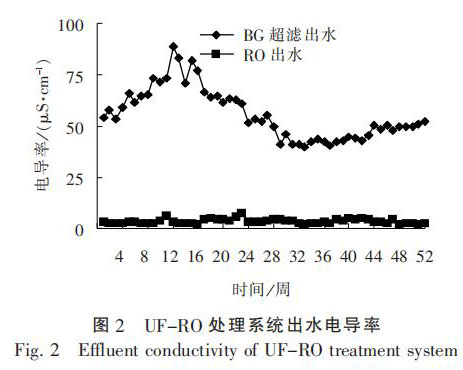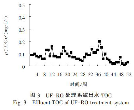 經(jīng)過 1 年的連續(xù)運(yùn)行, 晶背研磨廢水進(jìn)水 TOC質(zhì)量濃度為 0.5 ~ 5.0 mg / L, 濁度為 80 ~ 100 NTU,SiO2 質(zhì) 量 濃 度 為 2 ~ 4 mg / L, 反 洗 廢 水 進(jìn) 水 TOC質(zhì) 量 濃 度 為 1.5 ~ 3.0 mg / L, 濁 度 為 4 ~ 8 NTU,UF-RO 處理出水 TOC 質(zhì)量濃度低于 1 mg / L, 濁度低于 0.1 mg / L, SiO2 質(zhì) 量 濃 度 低 于 1 mg / L, 完 全可以回用至超純水預(yù)處理系統(tǒng)。 UF-RO 處理系統(tǒng)出水電導(dǎo)率和 TOC 濃度見圖 2 ~ 圖 3。