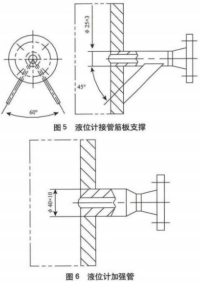 圖5是泄漏重油液位計(jì)接管結(jié)構(gòu),雖然必25mmx35mm接管的開孔補(bǔ)強(qiáng)滿足GB150-1989標(biāo)準(zhǔn)[11“開孔不另行補(bǔ)強(qiáng)”的要求,但卻不符合現(xiàn)行標(biāo)準(zhǔn)GB/T150-2011的“開孔不另行補(bǔ)強(qiáng)”要求。因?yàn)椋瑑蓸?biāo)準(zhǔn)雖然限制的設(shè)計(jì)壓力(<2.5MPa)與接管外徑(<89mm)等條件相同,但是后者改版標(biāo)準(zhǔn)卻對(duì)接管壁厚及腐蝕裕量增加了要求,這是合理的改進(jìn)完善。對(duì)于本例的425mm接管,滿足GB/T150-2011的“開孔不另行補(bǔ)強(qiáng)”條件的管壁厚度至少應(yīng)為5.5mm(按標(biāo)準(zhǔn)規(guī)定當(dāng)腐蝕裕量為1mm時(shí),接管厚度應(yīng)不小于3.5mm)。所以,按HG/T20583-2011對(duì)小接管避免彎曲而推薦的加強(qiáng)結(jié)構(gòu)優(yōu)先選用加強(qiáng)管形式建議將液位計(jì)接管更改為圖6的加強(qiáng)管結(jié)構(gòu)。這樣不但解決了小接管的開孔補(bǔ)強(qiáng)和防彎曲加強(qiáng)問題,也可以使小接管的設(shè)計(jì)使用年限與罐體一致,而且便于保證小接管與罐體采用插人式全焊透角焊縫的焊接質(zhì)量。