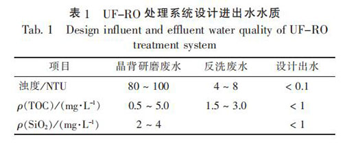 國內(nèi)某酸液液位計(jì)廠, 晶背研磨廢水產(chǎn)生量為 150 ~160 m3 / d, 反洗廢水產(chǎn)生量 為 500 ~ 700 m3 / d, 主要污染物為懸浮物, UF-RO 處理系統(tǒng)設(shè)計(jì)進(jìn)水和出水主要水質(zhì)指標(biāo)見表 1。