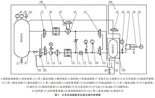 采用流動式管道加熱器能有效處理油箱油液加熱溫度的均勻性,避免油液加熱過程中的碳化現(xiàn)象;超溫保護由設置在油箱上的溫度傳感器采集的溫度數(shù)據(jù)判斷;齒輪油液位計指示油箱的液位并提供計算機顯示的液位數(shù)據(jù);集油油箱便于收集試件艙內(nèi)試件滲漏的油液,設置試件艙漏油檢測裝置,在高壓篩選試驗過程中當裝置檢測到滲漏的油液時試驗臺自動做出報警停機的處理;通過電動三通閥的換向可以將集油油箱中的油液抽回至系統(tǒng)油箱并過濾,便于油液的回收利用。