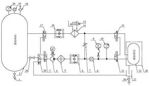 油液供油:原理中油液經(jīng)吸油開關(guān)(30)、L 形三通電動閥(3、29)、油泵(4)、加熱器(5)、供油過濾器(6)、流量計(8)、L 形三 通 電 動 閥(11)后進入被測油箱,然后 經(jīng) L形三通電動閥(13)、油水換熱器(14)、回油過濾器(16)、L 形三通電動閥回到設備油箱中,此條支路可提供被測油箱剛安裝于試驗臺上時的油液供給,通過流量計軟件計時的方法判斷補油量。