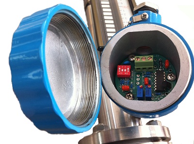 在磁翻板液位計(jì)上安裝變送器。變送器由傳感器和轉(zhuǎn)換器兩部分組成,它通過磁浮子上下移動(dòng),經(jīng)磁耦合作用使導(dǎo)管內(nèi)測量元件依次動(dòng)作,獲得電阻信號(hào)變化,轉(zhuǎn)換成0~10或4~20mA的標(biāo)準(zhǔn)電流信號(hào)輸出,以便與數(shù)字顯示儀表或計(jì)算機(jī)聯(lián)接,實(shí)現(xiàn)遠(yuǎn)傳顯示及控制。